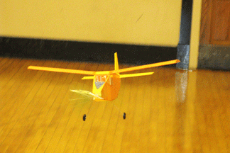 There are lighter, more fragile designs, but mine meets the "West Coast" rules used by Marin County fliers. Wing Area is 44 square inches. The length from propeller hook to the rear peg holding the rubber motor is 10.2 inches. The 6 inch diameter propeller is home made with blades cut from a 2 L soft drink bottle. It is turned by a 13 inch loop (2 strands) of 1/8 inch wide rubber. Winding to 1100 turns gives climb to the upper tier of Racine's Memorial Hall, and flight times of 60 to 70 seconds.