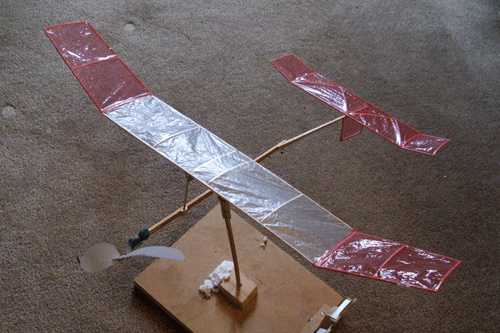 square inches. Total airframe mass, without the rubber motor, must be more than 8 grams. The maximum weight of the rubber motor is 2.0 grams, about the weight of a 12 inch loop of 1/8 inch wide FAI Tan rubber. The maximum propeller diameter was 240 mm ( 9.45 inches ), and may be home-made or commercially sourced. I tried to proportion my plane like the Chuck Markos Double Whammy, as far as moments and wing offset were concerned. Unlike my Whammy, the wing ribs in this plane are cut to a simplex camber, like those in the Limited Penny Plane version. I used polyethylene film for the covering.