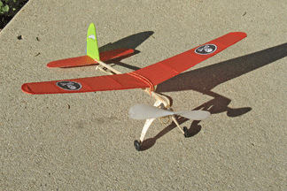 An indoor flight lasting over 1.5 min was posted on YouTube by sandfac of Glastonbury CT on 1/10/2016. Decorations were inspired by the popular Phantom comic strip. Wing span is 16 inches. In one memorable flight in Racine’s Memorial Hall, I lost a contest to the designer’s brother, Ed Konofes, even though my Flash flew for 83 seconds, circling near the 40 foot ceiling. Outdoors, on a sunny day you can easily lose a Flash.