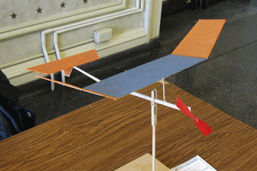 The rubber for the motor at the contests is handed out at registration, so test flying is required to feel it out. My best flight came with a freshly built Double Whammy and rubber about 0.080 inches wide, weighing 1.7 grams for a 14 inch loop. When I wound it to nearly 1500 turns, the flight lasted 77 seconds. Wing loading for the Double Whammy is quite low, at 0.7 ounces per square foot, and cube loading is just above 1 ounce per cubic foot. This is lower than for No-Cal Scale planes, but about the same as for the plane I built to 2015 Science Olympiad "Wright Stuff" rules.