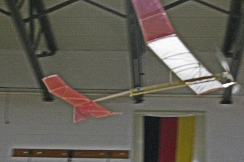 nces per square foot and cube loading is 1.2 ounces per cubic foot. This is a bit heavier than the loading for the Double Whammy. Winding the 14 inch loop to about 1200 turns gave flights of over 2 minutes with this plane in a school gym with about a 20 foot ceiling, where the inflight picture was taken, and at Rantoul, IL, in an old Hangar with a a higher ceiling. At Science Olympiad Nationals in May 2015, 6 planes made flights lasting between 4 and 5 minutes, and 24 teams had flight times over 3 minutes.