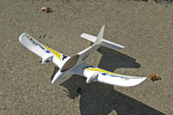 The Hobby Zone Duet is a very inexpensive introduction to the R/C hobby since it comes with its own Transmitter, which also charges the 1.7 Volt batteries it uses. Out doors, it is best to fly it when the wind is calm. Indoors, it's best to keep it away from walls and ceilings, as its molded foam parts can break. The two small motors are used to steer it by differential thrust. The elevator, along with the throttle, adjusts the climb.