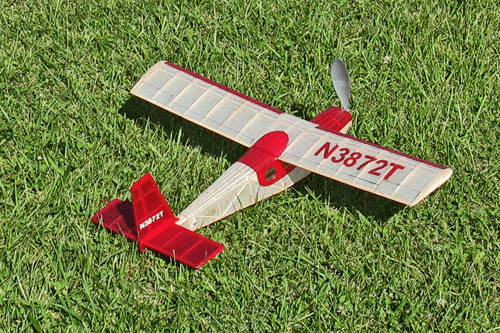 My Helio Courier weighed 114 grams with a motor of 4 loops (8 strands) of 1/8 inch wide FAI Tan rubber 20.5 inches long weighing 14 grams and turning a 9.5 inch Peck plastic prop usually for P-30 class planes.