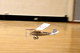 I have flown it in 9 meets at Racine Memorial hall until 2014, and it was still making 1 minute flights after repairs. Wing span is 16 inches and wing area is 52 square inches. Airframe weight is 8.8 grams, and with 1.5 grams rubber, total weight is 10.3 grams. Distance from propeller hook to rear hook for rubber is 8.5 inches. A 14 inch long loop (2 strands) of 3/32 inch wide FAI rubber was used to turn a 6 inch Peck silver prop. Flight times were up to 1 minute in Memorial Hall, after climb to near the 40 ft ceiling with 1000 -1300 turns wound in the motor. In a school gym with only 16 ft ceiling less winds (600) gives 20 sec flight.